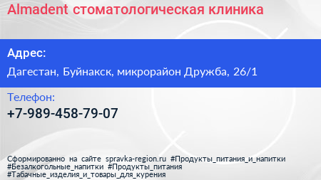 Almadent, стоматологическая клиника по адресу Дагестан, Буйнакск, микрорайон Дружба, 26/1 в дальнейшем Организация, размещена в следующих категориях: