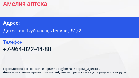 Амелия, аптека по адресу Дагестан, Буйнакск, Ленина, 81/2 в дальнейшем Организация, размещена в следующих категориях: