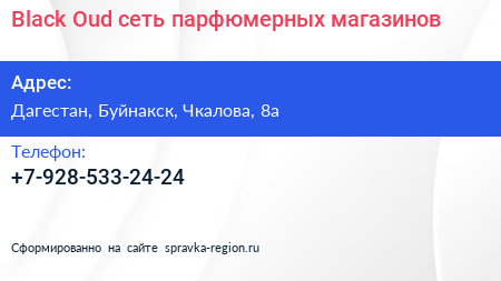 Black Oud, сеть парфюмерных магазинов по адресу Дагестан, Буйнакск, Чкалова, 8а в дальнейшем Организация, размещена в следующих категориях: