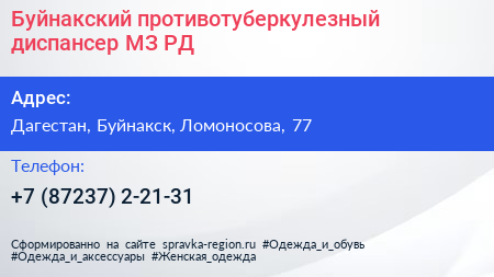 Буйнакский противотуберкулезный диспансер МЗ РД по адресу Дагестан, Буйнакск, Ломоносова, 77 в дальнейшем Организация, размещена в следующих категориях: