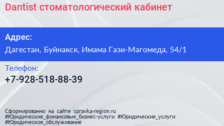 Dantist, стоматологический кабинет по адресу Дагестан, Буйнакск, Имама Гази-Магомеда, 54/1 в дальнейшем Организация, размещена в следующих категориях: