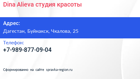Dina Alieva, студия красоты по адресу Дагестан, Буйнакск, Чкалова, 25 в дальнейшем Организация, размещена в следующих категориях: