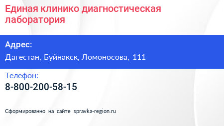 Единая клинико-диагностическая лаборатория по адресу Дагестан, Буйнакск, Ломоносова, 111 в дальнейшем Организация, размещена в следующих категориях: