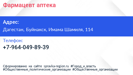 Фармацевт, аптека по адресу Дагестан, Буйнакск, Имама Шамиля, 114 в дальнейшем Организация, размещена в следующих категориях:
