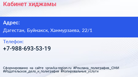 Кабинет хиджамы по адресу Дагестан, Буйнакск, Ханмурзаева, 22/1 в дальнейшем Организация, размещена в следующих категориях: