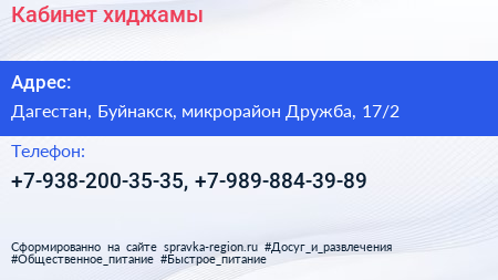 Кабинет хиджамы по адресу Дагестан, Буйнакск, микрорайон Дружба, 17/2 в дальнейшем Организация, размещена в следующих категориях: