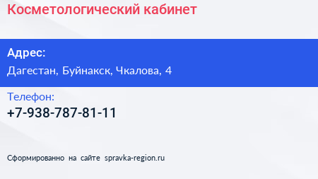 Косметологический кабинет по адресу Дагестан, Буйнакск, Чкалова, 4 в дальнейшем Организация, размещена в следующих категориях: