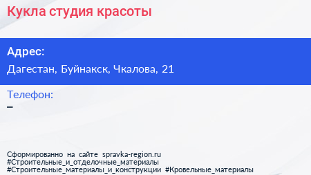 Кукла, студия красоты по адресу Дагестан, Буйнакск, Чкалова, 21 в дальнейшем Организация, размещена в следующих категориях:
