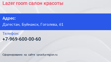 Lazer room, салон красоты по адресу Дагестан, Буйнакск, Гоголева, 61 в дальнейшем Организация, размещена в следующих категориях: