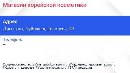 Магазин корейской косметики по адресу Дагестан, Буйнакск, Гоголева, 47 в дальнейшем Организация, размещена в следующих категориях: