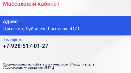 Массажный кабинет по адресу Дагестан, Буйнакск, Гоголева, 41/1 в дальнейшем Организация, размещена в следующих категориях: