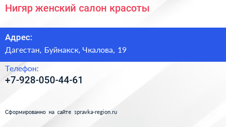 Нигяр, женский салон красоты по адресу Дагестан, Буйнакск, Чкалова, 19 в дальнейшем Организация, размещена в следующих категориях: