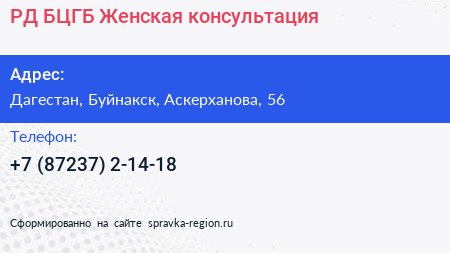 РД БЦГБ, Женская консультация по адресу Дагестан, Буйнакск, Аскерханова, 56 в дальнейшем Организация, размещена в следующих категориях:
