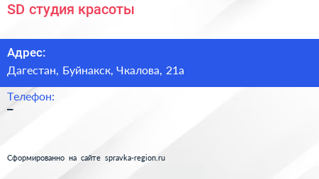 SD, студия красоты по адресу Дагестан, Буйнакск, Чкалова, 21а в дальнейшем Организация, размещена в следующих категориях:
