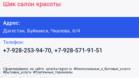 Шик, салон красоты по адресу Дагестан, Буйнакск, Чкалова, 6/4 в дальнейшем Организация, размещена в следующих категориях: