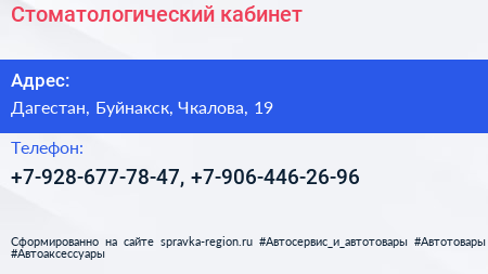 Стоматологический кабинет по адресу Дагестан, Буйнакск, Чкалова, 19 в дальнейшем Организация, размещена в следующих категориях: