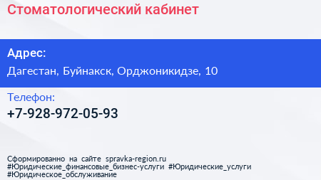 Стоматологический кабинет по адресу Дагестан, Буйнакск, Орджоникидзе, 10 в дальнейшем Организация, размещена в следующих категориях: