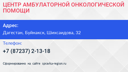 ЦЕНТР АМБУЛАТОРНОЙ ОНКОЛОГИЧЕСКОЙ ПОМОЩИ по адресу Дагестан, Буйнакск, Шихсаидова, 32 в дальнейшем Организация, размещена в следующих категориях:
