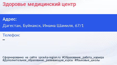 Здоровье, медицинский центр по адресу Дагестан, Буйнакск, Имама Шамиля, 67/1 в дальнейшем Организация, размещена в следующих категориях: