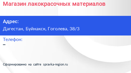 Магазин лакокрасочных материалов по адресу Дагестан, Буйнакск, Гоголева, 38/3 в дальнейшем Организация, размещена в следующих категориях: