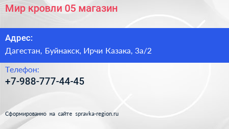 Мир кровли 05, магазин по адресу Дагестан, Буйнакск, Ирчи Казака, 3а/2 в дальнейшем Организация, размещена в следующих категориях: