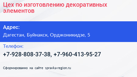 Цех по изготовлению декоративных элементов по адресу Дагестан, Буйнакск, Орджоникидзе, 5 в дальнейшем Организация, размещена в следующих категориях: