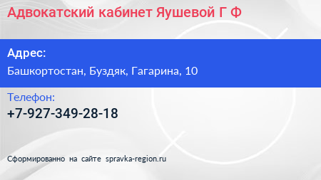 Адвокатский кабинет Яушевой Г.Ф. по адресу Башкортостан, Буздяк, Гагарина, 10 в дальнейшем Организация, размещена в следующих категориях: