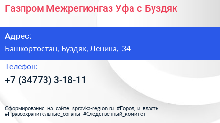 Газпром Межрегионгаз Уфа, с. Буздяк по адресу Башкортостан, Буздяк, Ленина, 34 в дальнейшем Организация, размещена в следующих категориях: