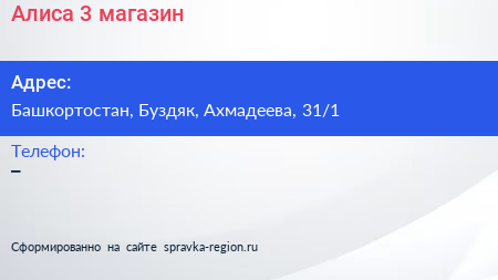 Алиса-3, магазин по адресу Башкортостан, Буздяк, Ахмадеева, 31/1 в дальнейшем Организация, размещена в следующих категориях: