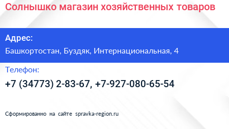 Солнышко, магазин хозяйственных товаров по адресу Башкортостан, Буздяк, Интернациональная, 4 в дальнейшем Организация, размещена в следующих категориях: