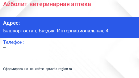 Айболит, ветеринарная аптека по адресу Башкортостан, Буздяк, Интернациональная, 4 в дальнейшем Организация, размещена в следующих категориях: