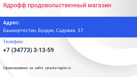Ядрофф, продовольственный магазин по адресу Башкортостан, Буздяк, Садовая, 17 в дальнейшем Организация, размещена в следующих категориях: