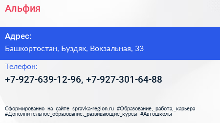 Альфия по адресу Башкортостан, Буздяк, Вокзальная, 33 в дальнейшем Организация, размещена в следующих категориях: