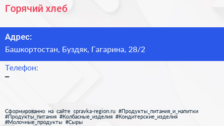 Горячий хлеб по адресу Башкортостан, Буздяк, Гагарина, 28/2 в дальнейшем Организация, размещена в следующих категориях:
