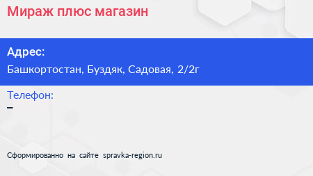 Мираж плюс, магазин по адресу Башкортостан, Буздяк, Садовая, 2/2г в дальнейшем Организация, размещена в следующих категориях: