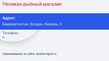 Пеликан, рыбный магазин по адресу Башкортостан, Буздяк, Кирова, 5 в дальнейшем Организация, размещена в следующих категориях: