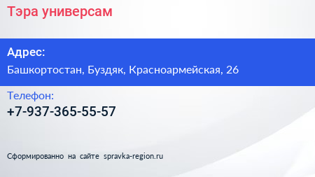Тэра, универсам по адресу Башкортостан, Буздяк, Красноармейская, 26 в дальнейшем Организация, размещена в следующих категориях:
