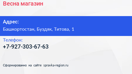 Весна, магазин по адресу Башкортостан, Буздяк, Титова, 1 в дальнейшем Организация, размещена в следующих категориях: