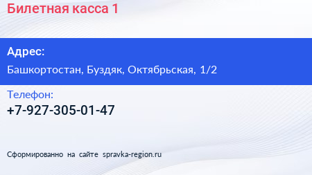 Билетная касса №1 по адресу Башкортостан, Буздяк, Октябрьская, 1/2 в дальнейшем Организация, размещена в следующих категориях: