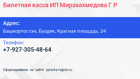 Билетная касса, ИП Мирзаахмедова Г.Р. по адресу Башкортостан, Буздяк, Красная площадь, 24 в дальнейшем Организация, размещена в следующих категориях:
