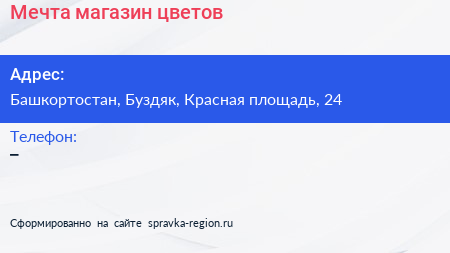 Мечта, магазин цветов по адресу Башкортостан, Буздяк, Красная площадь, 24 в дальнейшем Организация, размещена в следующих категориях: