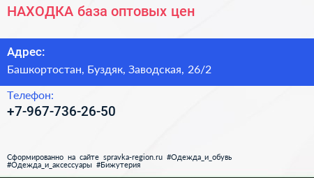 НАХОДКА, база оптовых цен по адресу Башкортостан, Буздяк, Заводская, 26/2 в дальнейшем Организация, размещена в следующих категориях: