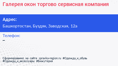 Галерея окон, торгово-сервисная компания по адресу Башкортостан, Буздяк, Заводская, 12а в дальнейшем Организация, размещена в следующих категориях: