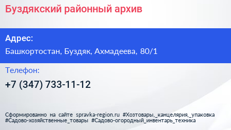 Буздякский районный архив по адресу Башкортостан, Буздяк, Ахмадеева, 80/1 в дальнейшем Организация, размещена в следующих категориях: