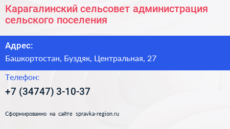 Карагалинский сельсовет, администрация сельского поселения по адресу Башкортостан, Буздяк, Центральная, 27 в дальнейшем Организация, размещена в следующих категориях: