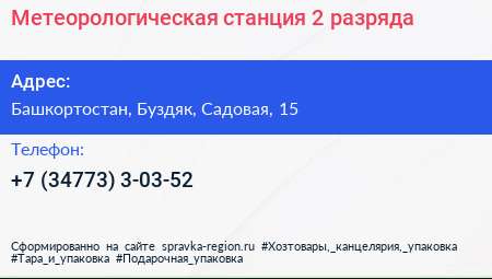 Метеорологическая станция 2 разряда по адресу Башкортостан, Буздяк, Садовая, 15 в дальнейшем Организация, размещена в следующих категориях:
