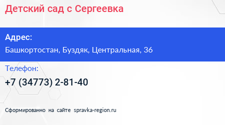 Детский сад, с. Сергеевка по адресу Башкортостан, Буздяк, Центральная, 36 в дальнейшем Организация, размещена в следующих категориях: