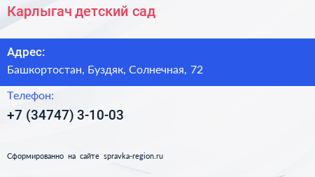 Карлыгач, детский сад по адресу Башкортостан, Буздяк, Солнечная, 72 в дальнейшем Организация, размещена в следующих категориях: