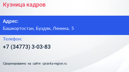 Кузница кадров по адресу Башкортостан, Буздяк, Ленина, 5 в дальнейшем Организация, размещена в следующих категориях: