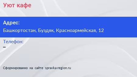 Уют, кафе по адресу Башкортостан, Буздяк, Красноармейская, 12 в дальнейшем Организация, размещена в следующих категориях: